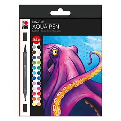 Marabu 014500000106 Aqua Pen Graphix, Octopy, 24 Watercolour Felt Tip Pens in Set with Brilliant Colour, Water Based Ink, Double Tip, Paper