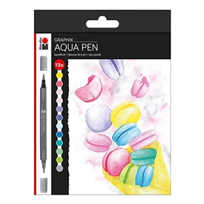 Watercolour brush pens in a set of 12 different colours Double tip - contour tip and flexible brush tip Water-based, light-resistant and low-odour paint Brilliant colours Water-soluble and water-coloured