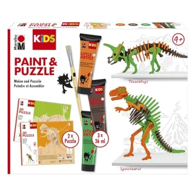 USE – Expand your kids creative tool kit with the Little Artist puzzle & paint set. The dinosaur puzzle toy engages young minds and is fun for everyone. From toddler to older kids, the paint is safe and washable if the children make a mess! CONTENTS - The Kids Paint & Puzzle Set comes complete with 3x 36ml Little Artist art and craft paints in vibrant; green, orange and brown. The set also includes a robust flat brush no. 10, perfect for precise and smooth application of the paints. CREATIVITY – Create stunning puzzle toys with this prehistoric art set! The Kids Toys have to be built with various pieces which adds to the personalised feel of the kit. Display the model with pride after you have painted it your favourite shade. WASHABLE - To ensure a mess-free experience, it is recommended to wear old clothes or a painting apron while painting the puzzle pieces. Rest assured, any paint stains on fabric can be promptly washed out at 30°C, allowing for worry-free creativity. BRAND - Marabu is renowned for its commitment to quality and innovation, and the Little Artist Sets are no exception. They offer superior performance, durability and versatility, making them a trusted choice for children and young artists.