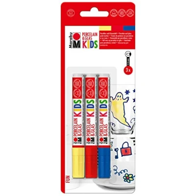 Extra thick and grippy porcelain and glass colouring pen for children Ideal for painting porcelain, glass and ceramic Set of 3 with yellow, cherry red and dark blue Dishwasher safe up to max. 50 °C after baking in the oven (160 °C, 30 min.) With sturdy round tip and easy filter system