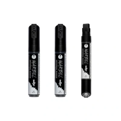 Set of 3 MARBEL universal markers with black acrylic paint The 15 mm wide rectangular tip is ideal for large creative projects, whether for wall art, posters or bold designs. Colour: BLACK. Available in 10 classic colours. Multi-purpose: Available with 6 different nibs, it adapts to all creative needs: writing, drawing, calligraphy, tracing outlines, creating street lettering, filling in flat areas, on small or large formats. Instructions for use: Shake the marker until you hear the ball mixing the paint, remove the cap, pump the tip until ink comes out - close after use and store horizontally - replacement tips for each model Multi-surface: Marbel paint can be applied to paper, wood, metal, fabric, glass, etc. Permanent on most surfaces, it offers a matt, opaque finish, dries quickly and is lightfast.