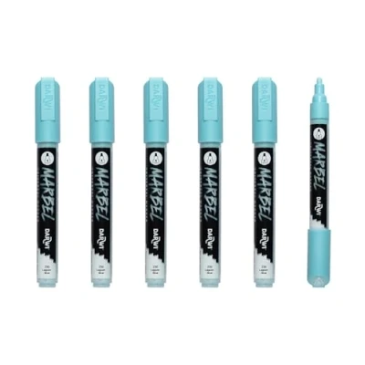 Set of 6 MARBEL universal markers with lagoon blue acrylic paint The medium 4mm round tip is ideal for all types of work, large or small. It is perfect for drawing, colouring or adding creative touches to your projects. Colour: LAGOON BLUE. Available in 40 classic colours. Multi-purpose: Available with 6 different nibs, the marker adapts to all creative needs: writing, drawing, calligraphy, tracing outlines, creating street lettering, filling in flat areas, on small or large formats. Instructions for use: Shake the marker until you hear the ball mixing the paint, remove the cap, pump the tip until ink comes out - close after use and store horizontally - replacement tips for each model Multi-surface: Marbel paint can be applied to paper, wood, metal, fabric, glass, etc. Permanent on most surfaces, it offers a matt, opaque finish, dries quickly and is lightfast.