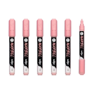 Set of 6 MARBEL universal markers with soft pink acrylic paint The medium 4mm round tip is ideal for all types of work, large or small. It is perfect for drawing, colouring or adding creative touches to your projects. Colour: SOFT PINK. Available in 40 classic colours. Multi-purpose: Available with 6 different nibs, the marker adapts to all creative needs: writing, drawing, calligraphy, tracing outlines, creating street lettering, filling in flat areas, on small or large formats. Instructions for use: Shake the marker until you hear the ball mixing the paint, remove the cap, pump the tip until ink comes out - close after use and store horizontally - replacement tips for each model Multi-surface: Marbel paint can be applied to paper, wood, metal, fabric, glass, etc. Permanent on most surfaces, it offers a matt, opaque finish, dries quickly and is lightfast.