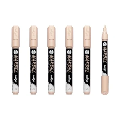 Set of 6 MARBEL universal markers with nude acrylic paint The medium 6mm chisel tip is ideal for creating slanted lines, shadows and curves, as well as effects with variations in thickness. Colour: NUDE. Available in 18 classic colours. Multi-purpose: Available with 6 different nibs, it adapts to all creative needs: writing, drawing, calligraphy, tracing outlines, creating street lettering, filling in flat areas, on small or large formats. Instructions for use: Shake the marker until you hear the ball mixing the paint, remove the cap, pump the tip until ink comes out - close after use and store horizontally - replacement tips for each model Multi-surface: Marbel paint can be applied to paper, wood, metal, fabric, glass, etc. Permanent on most surfaces, it offers a matt, opaque finish, dries quickly and is lightfast.