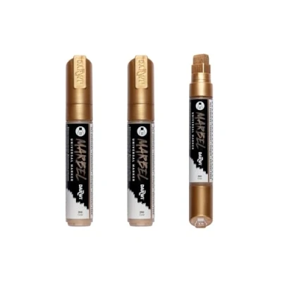 Set of 3 MARBEL universal markers with gold acrylic paint The wide 15mm rectangular tip is ideal for large creative projects, whether for wall art, posters, or bold designs. Gold colour. Available in 2 metallic colours Multi-purpose: Available with 6 tips, it adapts to all creative needs: writing, drawing, calligraphy, outlining, creating street lettering, filling in solid areas, on small or large formats. Instructions for use: Shake the marker until you hear the mixing ball rattle, remove the cap, pump the tip until ink flows – close after use and store horizontally – replacement tips for each model Multi-surface: Marbel paint can be applied to paper, wood, metal, textiles, glass, etc. Permanent on most surfaces, it offers a matte and opaque finish, dries quickly and is lightfast.