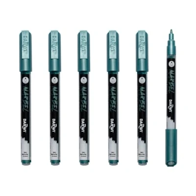 Set of 6 MARBEL universal markers with acrylic paint in metallic green The fine 2mm conical tip is perfect for small-format creations, ideal for writing, outlining, and illustration. Metallic Green. Available in 6 metallic colours. Multi-purpose: Available with 6 tips, it adapts to all creative needs: writing, drawing, calligraphy, outlining, creating street lettering, filling in solid areas, on small or large formats. Instructions for use: Shake the marker until you hear the mixing ball rattle, remove the cap, pump the tip until ink flows – close after use and store horizontally – replacement tips for each model Multi-surface: Marbel paint can be applied to paper, wood, metal, textiles, glass, etc. Permanent on most surfaces, it offers a matte and opaque finish, dries quickly and is lightfast.