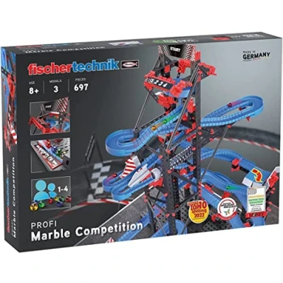EXCITING CHILDREN'S TOY: The marble run track includes a variety of action pieces with which your child can build different tracks for fast marble races, whether alone or with friends. INTERESTING EXTRAS: On their turbulent journey through the track, the marbles navigate high-speed flexible profiles and wide 180-degree curves, allowing them to overtake each other. UNEXPECTED TWISTS: To keep the excitement until the end, various obstacles can slow down or stop a marble, adding an extra thrill to the race. PLAY AND LEARN: With this marble game, your child can playfully develop creativity, motor skills, hand-eye coordination, and technical understanding, following our motto, "Understanding technology through play." PACKAGE CONTENTS: 1 x Marble Competition, exploration toy for girls and boys aged 8 and up, marble roller coaster to assemble with 697 pieces from fischertechnik, made in Germany., Manufacturer: fischertechnik