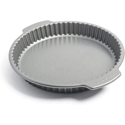 The KitchenAid Metal Bakeware Quiche Pan (28cm) features high-quality aluminised steel with a non-stick coating for even baking and easy release, sculptured edges for attractive presentation, and is oven-safe to 230°C and dishwasher-safe, making it ideal for perfect quiches and pastries.