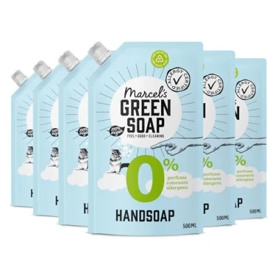 Marcel's Green Soap 0% Hand Soap is enriched with essential oils and extra glycerine for smooth and supple hands. Our Hand Soap Refill Pack with a resealable spout saves 79% plastic when compared to a bottle, and is perfect for refilling your 0% Hand Soap bottle. Marcel's Green Soap Hand Soap Refill is made with renewable ingredients, 97% biodegradable and vegan. With this convenient refill pack, including a resealable spout, you save 79% plastic compared to bottle of hand soap! Marcel's 0% products contain no perfume, dyes or allergens, and are allergy-certified. Perfect for people with sensitive skin. Marcel promises 3 things about his products: they smell wonderful, work fantastically and are plant-based. That's what we call ‘Feel Good Cleaning’!