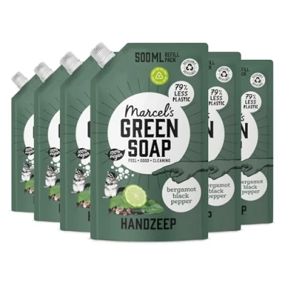 Marcel's Green Soap Hand Soap Black Pepper & Bergamot is 97% biodegradable and enriched with extra vegetable glycerine for super-soft hands. Our Hand Soap Refill Pack with a resealable spout saves 79% plastic when compared to a bottle, and is perfect for refilling your Black Pepper & Bergamot Hand Soap. Marcel's Green Soap Hand Soap Refill is made with renewable ingredients, 97% biodegradable and vegan. With this convenient refill pack, including a resealable spout, you save 79% plastic compared to bottle of hand soap! Marcel's Green Soap Black Pepper & Bergamot Hand Soap is a spicy pepper combined with the citrus note of bergamot: this scent will keep you on your toes! Bergamot is an orange oil from the northern Italian town of Bergamo (thank you, Wikipedia) and in addition to its freshness, it adds a sweet note to this delicious scent combination. Marcel promises 3 things about his products: they smell wonderful, work fantastically and are plant-based. That's what we call ‘Feel Good Cleaning’!
