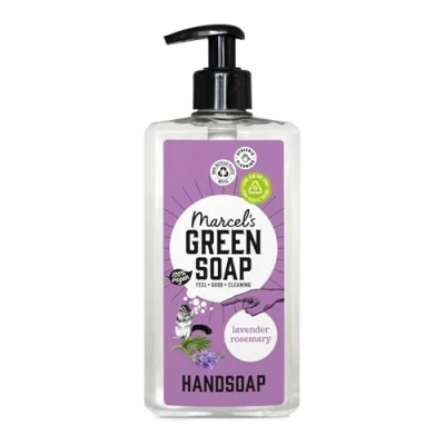 Marcel's Green Soap Hand Soap Lavender & Rosemary is at least 97% biodegradable and enriched with extra vegetable glycerine for super-soft hands. This Hand Soap comes in a bottle made of 100% recycled plastic and is refillable with our hand soap refills, which save on plastic. Marcel's Green Soap Hand Soap is made with renewable ingredients, at least 97% biodegradable and 100% vegan. The formula of this hand soap is microplastic-free and comes in a bottle made of 100% recycled plastic. Lavender, the scent of grandma's closet, is soothing and stress-reducing. Forgot what that linen closet smells like? Luckily, Rosemary is good for your memory! So you can not only freshen up your home, but also clear your mind! Marcel promises 3 things about his products: they smell wonderful, work fantastically and are plant-based. That's what we call ‘Feel Good Cleaning’!