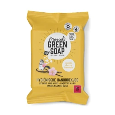 Marcel's Green Soap Vanilla & Cherry Blossom Hygienic Hand Wipes are ideal for on-the-go! These wipes are nice and soft on the skin thanks to added glycerine and aloe vera and contain alcohol for extra hygiene. Our hygienic cleaning wipes come in recyclable packaging. Finished cleaning? Don't forget to toss them in the bin! Marcel's Green Soap Hygienic Hand Wipes are vegan and made with 98% natural ingredients. Our hand wipes come in recyclable packaging and are made of viscose fibres! Includes glycerin and aloe vera for extra soft skin. Cherry blossom symbolises rejuvenation and the beginning of spring. It's a fragrance that'll make you feel brand new! As a finishing touch, Marcel also added a dash of vanilla, creating a truly soothing fragrance. Marcel promises 3 things about his products: they smell wonderful, work fantastically and are plant-based. That's what we call ‘Feel Good Cleaning’!