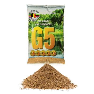 Marcel Van Den Eynde G5 - Available in several varieties! - Groundbait - Weight: 2kg - All-round use - Suitable for whitefish and carp - Fine to slightly coarse structure - Use on different types of water! Marcel Van Den Eynde’s G5 is an all-round groundbait suitable for fishing on all kinds of water types. It was developed to lure many different species of fish such as roach, bream, tench, crucian carp and carp. The groundbait is fine to slightly coarse in texture and does not stick very much. This makes the groundbait pure use when the water is calm or not flowing. When the water to be fished is extremely deep or flows extremely hard it is recommended to weight the G5 with some clay clay and/or a variant of the Record bait. The G5 Black variant is best used when fishing clear waters.