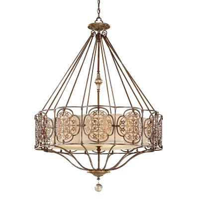 This striking pendant chandelier an imposing look of ornate filigree finished in hand applied bronze and gold patina. With amazing attention to detail this fitting will make a statement in any situation it is placed. This fitting includes a bottom glass diffuser. Also available in this range; Pendant Uplight, Semi- Flush Mount, 2lt Wall Light, 8lt Chandelier, Table lamp, Floor Lamp, and 1lt Wall Light.