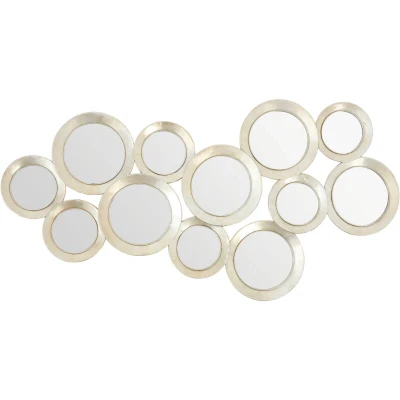 ManoManoGeneral description Made from solid metal, this wall mirror features twelve individual circles arranged in a flowing design that creates the impression of bubbles floating in mid-air. The reflective silver finish has a slightly weathered surface, adding texture and character to the piece.