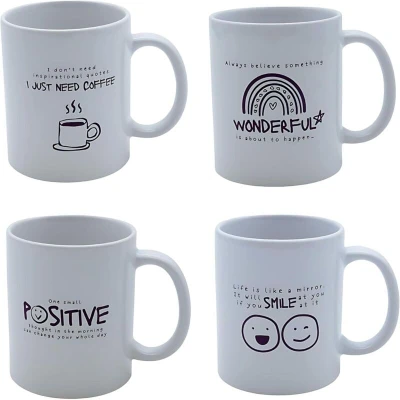 General description Start your mornings with positivity using our Set of 4 Motivational Coffee Mugs. Each mug is designed with a unique uplifting or witty quote, making them perfect for adding a touch of encouragement and humor to your daily routine. With a generous 300ml capacity and sturdy ergonomic handles, they are ideal for coffee, tea, hot chocolate, or any hot beverage. A thoughtful gift idea for women, friends, colleagues, or family on birthdays, Christmas, graduations, or other special occasions. Technical specifications Set Includes: 4 mugs with different motivational designs Capacity: 300ml each Material: High-quality ceramic Finish: White with bold printed text Dishwasher & Microwave Safe: Yes Usage Daily Use: Great for coffee breaks, cozy evenings, or long chats with friends. Office or Home: Perfect for adding motivation to your workspace or kitchen. Gift Option: A meaningful and practical present for birthdays, Christmas, exam celebrations, or thank-you gifts. Friendship