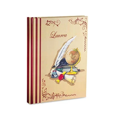 Photo album with 30 sheets (60 pages) in white cardboard, vegetable parchment paper tissue to prevent the photos from sticking together, including 2 pages customizable graduation diary pages Made entirely in Italy from Italian materials First two pages with diary Comes with gift box It can be a special gift or an album to store photos of your important memories