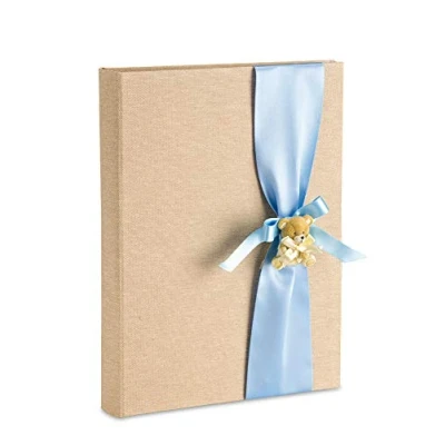 Photo album useful size 23 x 30 cm with 30 sheets (60 pages) made of white cardboard, tissue in vegetable parchment paper to prevent the photos from sticking together including 4 personalised birth diary pages. Made entirely in Italy with Italian materials. Linen cover, blue satin bow applique and baby bear Comes with a gift box. It can be a special gift or album to store photos of your important memories.