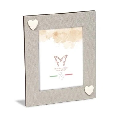 Photo frame for table cm 20x23.5 for photo 13x18, prepared for vertical position. The frame is made of natural linen fabric with white cloth hearts and the back is made of natural wood. To make the item safe in case of fall, we preferred to replace the glass with a transparent pvc sheet to protect the photo. The photo frame is supported by a chromed metal foot to insert into the slots on the back of wood. Packaging in a gift box. Made in Italy with Italian material.