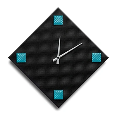 Wall clock total size from vertex to vertex 42x42cm, side 30cm. 4mm MDF wooden inner frame dial, the wood is not visible but covered with embossed matte black paper with a check embossing. The clock is ready to hang. Satin metal hands and application of 4 Turquoise Enameled Metal Studs with Mesh Texture The mechanics are equipped with a continuous quartz movement from the "basic" series Chrono series. The continuous rotation without the annoying tick-tac, makes this mechanism quieter and more precise. The watch is powered by a 1.5V AA battery (not supplied). Packed in a cardboard box to protect it from impact. Made entirely in Italy. Note: When calibrating the time or working, you should first move the hands to the position at 12 o'clock and then put the battery and start adjusting the pointer
