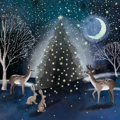 DESIGN: Beautiful moonlit forest scene featuring illuminated Christmas tree, deer, and rabbits against a starry night sky, perfect for spreading festive cheer BLANK INSIDE: Blank interior allows for personalised messages and greetings PACK CONTENTS: Set of 10 identical Christmas cards measuring 14x14cm, complete with 10 white envelopes CHARITABLE IMPACT: All profits support Marie Curie's expert care and support services for families facing terminal illness QUALITY ASSURANCE: Crafted in the UK using FSC-certified paper and board materials for premium quality
