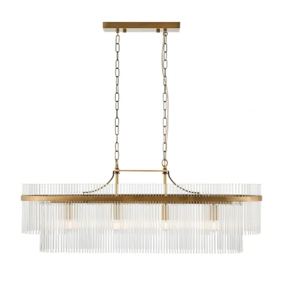 This linear 4 light pendant is perfect for adding a classic timeless look to dinning rooms. Finished in antique brass and decorated with clear glass rods that delicately diffuse the light, suspended from height adjustable chain, with clear flex.