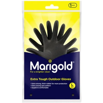 General description The Marigold Extra Tough Outdoor Gloves are designed for tough jobs, providing maximum protection and durability. These gloves are the thickest in the range, ensuring your hands are well-protected during demanding tasks. Technical specifications Material: Double-layered latex Cotton-lined for comfort Size: Large Quantity: 6 pairs Other information WARNING: This product contains natural latex which may cause an allergic reaction in individuals sensitive to latex.