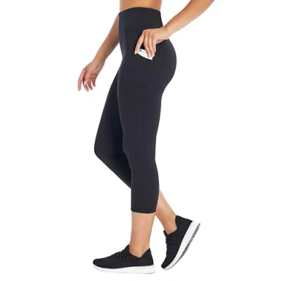 81% Polyester, 19% Spandex Imported Machine Wash High rise mid calf legging with a 4" curved waistband lined with Powermesh to provide full coverage, tummy control and a slimming compression. Slimming side panels with pockets to hold small personal items..Breathable Coolmax gusset lining will keep you comfortable while wicking away moisture and accelerating drying..Inseam: 22 inches.Weave type: Knit.Sport type: Exercise & Fitness