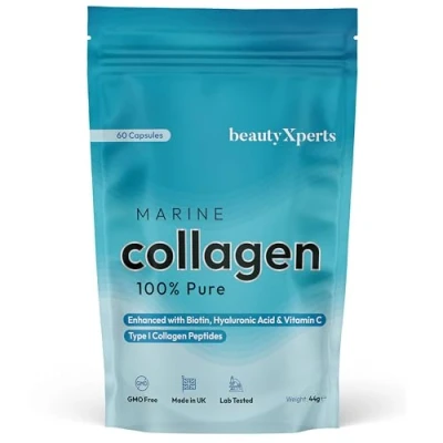 HIGH STRENGTH MARINE COLLAGEN: Collagen is the most abundant protein in the human body, it is present in the bones, muscles, skin, and tendons. As we age, natural production starts to slow, making Collagen Supplements very popular. WITH BIOTIN, HYALURONIC ACID & VITAMIN C: Each serving (2 capsules daily) contains 1000mg Of Marine Collagen, 100mg Of Hyaluronic Acid, 80mg Of Vitamin C, 150mcg Of Biotin. Collagen helps our body to maintain skin elasticity and firmness. Biotin can help contribute to the maintenance of normal skin & hair while hyaluronic Acid A natural substance in the body which aids hydration. Vitamin C also contributes to normal collagen formation for the normal function of the skin. SUPPLEMENTS FOR MEN & WOMEN: Suitable supplements for women and men. Our complex of Marine Collagen, Hyaluronic Acid, Biotin and Vitamin C are designed to help give your body and skin a boost. Easy swallow and fast absorbing capsules - 7.6mm x 21.6mm. TYPE 1 HYDROLYSED COLLAGEN PEPTIDES: High Quality & Strength marine collagen complex ideal to help you with your health and wellness goals. Unflavoured supplements from our high-quality fish-based collagen gives you the strength you want without the unpleasant taste. MADE IN THE UK: Researched, tested and produced here in FDA & ISO certified UK labs. Our formulas are Gluten free, Soy Free, Dairy free and GMO Free. 60 Capsules (not tablets or powder) gives you a month supply. Fully recyclable and letter box friendly packaging. Never miss a delivery again!