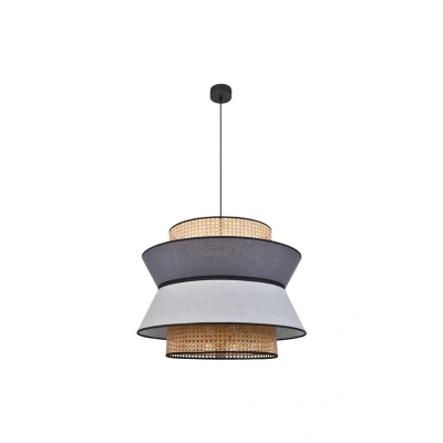 Lights.coSingapour XL pendant light with two-layer shade made of textile and Viennese wickerwork The Singapour pendant light impresses with its naturalness and cosy appearance in both private and public/commercial interiors. The light source from French design label MARKET SET has a slightly Asian feel and is characterised by the look of the shade. This is made up of an inner layer of rattan processed into a Viennese weave and an outer layer of textile. The latter is divided into two sections of linen textile in contrasting colours. Black edges serve as a modern stylistic device to emphasise the individual elements. A black suspension with textile cable and metal canopy completes the pendant light.