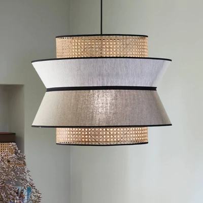 Lights.coSingapour XL pendant light with two-layer shade made of textile and Viennese wickerwork The Singapour pendant light impresses with its naturalness and cosy appearance in both private and public/commercial interiors. The light source from French design label MARKET SET has a slightly Asian feel and is characterised by the look of the shade. This is made up of an inner layer of rattan processed into a Viennese weave and an outer layer of textile. The latter is divided into two sections of linen textile in contrasting colours. Black edges serve as a modern stylistic device to emphasise the individual elements. A black suspension with textile cable and metal canopy completes the pendant light.