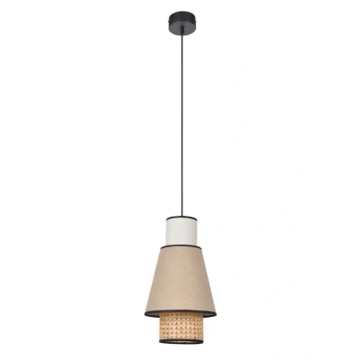 The hanging light combines timeless design with high-quality materials such as textile, rattan and metal. The harmonious colour scheme in light wood tones and nude creates a warm, inviting atmosphere. The textile cable further emphasises the elegant look, making the light a special eye-catcher.
