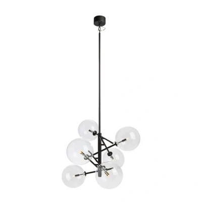 Lamp MastersAndrew 6 Pendant Black/Clear leaves a lasting impression with its sleek and stylish design that also has a slightly dramatic character. The black metal frame creates a tangle of branches, each ending in a voluminous glass shade. The modern appearance makes the Andrew 6 Pendant light particularly ideal for contemporary interiors. Each of the six glass shades is completely transparent, allowing a clear view of the light source inside. The light is also reflected in the glass, creating cosy light accents that make the lampshades resemble soap bubbles and give them a floating appearance - a beautiful and appealing lamp for any living room.