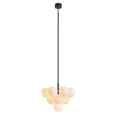 Merlot 13 Pendant lamp Light Black/White is a stylish and modern answer to the classic chandelier. With its shape-oriented design, neutral colour scheme and 13 light sources, Merlot creates an atmospheric ambience and adds an extra touch to the room's aesthetics. Each of the lamp's light sources is surrounded by a voluminous, spherical opal glass lampshade. The lampshades are arranged in a beautiful pyramid shape with the tips pointing downwards towards the room, creating a beautiful, structured whole.
