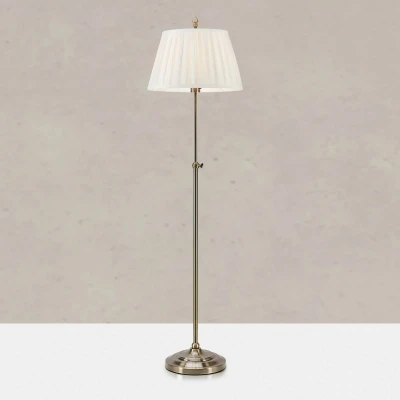 Oxford floor lamp – height adjustable from 118 cm to 155 cm The Oxford floor lamp combines timeless elegance with functional versatility. Made from fabric and iron, it blends seamlessly into various interior designs. The combination of a brass-coloured frame and a natural white lampshade adds a stylish touch to any living room, dining room or bedroom. The careful selection of materials ensures a harmonious balance between aesthetics and durability. An outstanding feature of the Oxford floor lamp is its height adjustability, which allows it to be flexibly adapted to different lighting needs. Whether as accent lighting in the living room or as a reading light in the bedroom, the lamp always provides the right light intensity. The well-thought-out construction and elegant design make the Oxford floor lamp an indispensable element of modern interior design. The switch is located on the lamp socket.