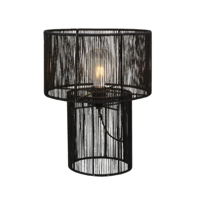 Soga 1 Table lamp Black is a rustic lighting collection with a consistent and coherent design that both creates beautiful and decorative lighting and gives the interior a stylish lift through its appealing design. The series consists of table and pendant lamps, available in matt black and natural colours, and is characterised by a beautiful double-shade design that beautifully combines cylindrical shapes into a harmonious whole. The lampshades are made of jute and processed by hand, which further emphasises the rustic character of the lamp. The jute yarn is shaped in an intricate pattern that is loose enough to allow a view of the light source inside, yet dense enough to shield the light from glare. The lamp is equipped with a large standard socket that fits many different types of bulbs. It is therefore a good idea to equip the lamp with a decorative bulb model, such as a globe bulb. Choose a clear light source for a beautiful light effect from the jute threads around the lamp.