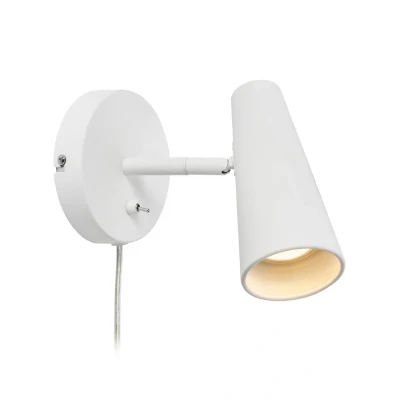 The Crest Wall Light White from Markslöjd is the perfect addition to your home if you are looking for an elegant and functional lighting solution. Made of iron and painted in a stylish white colour, this wall-mounted lamp fits ideally into both modern and classic interiors. With its cone-shaped, adjustable lampshade in matte metal, the Crest wall light is designed to provide optimal lighting, whether you use it as a reading lamp by your favourite armchair or as a practical bedside lamp. The 2 metre long transparent cable with a switch on the wall plate makes it easy to turn the lamp on and off, while the included mounting bracket ensures a stable setup. The lamp has a GU10 socket and can use up to 7W LED light bulbs, allowing you to choose the brightness that best suits your needs. Make your home brighter and more inviting with this versatile wall light.