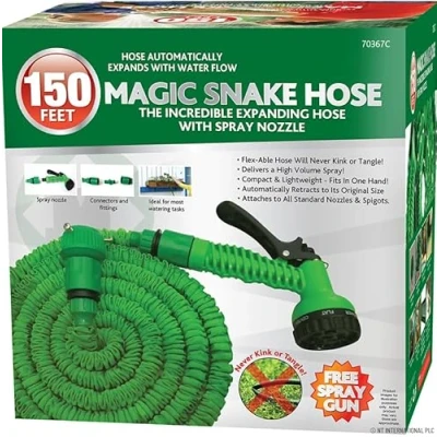 EXPANDABLE DESIGN: The Marksman 150ft (45m) Magic Garden Hose expands up to 3 times its original length when filled with water and shrinks back for compact storage. LIGHTWEIGHT & FLEXIBLE: Designed for effortless use, this hose is tangle-free, kink-free, and easy to maneuver around your garden. DURABLE TRIPLE-LAYER LATEX CORE: Made with a strong, leak-proof inner tube, providing high pressure resistance and long-lasting durability. MULTI-FUNCTION SPRAY NOZZLE: Comes with a 7-pattern spray gun for various watering needs, including jet, mist, shower, flat, soaker, cone, and center modes. HIGH-QUALITY BRASS CONNECTORS: Features solid brass fittings that ensure a secure, leak-proof connection to standard garden taps. PERFECT FOR VARIOUS USES: Ideal for watering gardens, washing cars, cleaning patios, and more., Manufacturer: Marksman