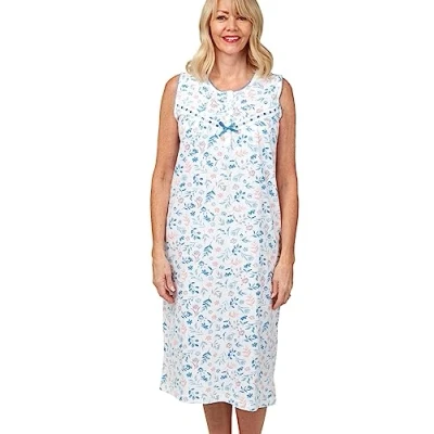 DESIGN . Gathered details at the neckline for a flattering look and a convenient short button placket for easy dressing. The neckline and armholes of this sleeveless nightgown for women are accented with delicate picot edging. The Lyla print option features ribbon slot detailing at the yoke seam and is 45" long, while the Harvest Floral print option has a simple design with no trims and is 42" long. FABRIC & PRINT . The fabric, a high-quality 100% cotton jersey, is incredibly soft . Our Layla print has Pink or Blue options and has a rustic, hand drawn style. Our Harvest Floral print has Pink & Blue options and has graphic scattered floral motifs. Looking for more comfy & stylish pyjamas for women? Why not visit our Marlon storefront for soft knitted classic revere collar pyjama sets, cosy brushed cotton wincyette PJs and fresh cropped ladies pyjamas too, for warmer evenings. Visit out Marlon Store front for our collection of classic lingerie, underwear and knickers. You'll find pure cotton full briefs, maxi knickers, traditional high rise briefs for women and more. Our lingerie range for ladies includes front fastening bras & front closure brassieres, everyday wirefree bras and a range of cling resist slips, petticoats and camisoles.