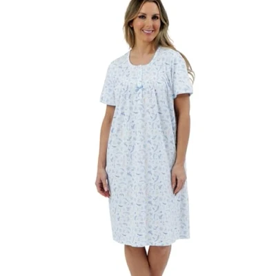 Short Nightdress For Women - Our Marlon Marcia nightie is the shorter version of our popular Maria nightgown, offering a classic 102cm (40") length for ease & comfort. Premium Sleepwear Fabric - Made from soft 160gsm 100% combed cotton jersey or easy-care 65% polyester / 35% cotton blend , high-quality fabrics designed for comfort, style, and long-lasting wear. Beautiful Prints & Colours -Available in multiple floral prints and solid colours, perfect for women’s nightwear and loungewear. Elegant Details -Nightdress options include broderie anglaise ribbon-slot trim and matching ribbon or simply classic trim-free nightie designs Looking for gifts for her or present for mum? Why not visit our Marlon Storefront for more classic ladies loungewear, soft nighties and plush fleece housecoats, robes & bedjackets.