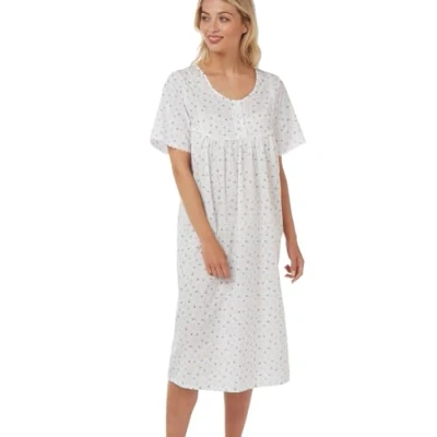 Our Molly easy-care printed ladies classic nightdress features delicate lace trim, a feminine detail that compliments our pretty prints. You'll find practical short sleeves and a fully functional buttoned placket for ease of dressing , finishes at the curved yoke seam. Measuring up at 45" our easy-care Molly womens nightdress sleepwear makes a lovely everyday choice for year-round sleeping in style. Why not visit our Marlon Shopfront for more classic & traditional womens nightwear, cosy fleece housecoats & robes & dressing gowns and bedjackets for mum.