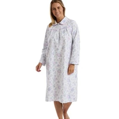 CLASSIC & COSY Our Candace brushed woven cotton nightdress has cosy long sleeves, an elegant peter pan collar and an easy-to-wear short button placket. You'll find flattering gathers flow from the yoke creating a body-skimming silhouette . WONDERFULLY WARM We've created our classic womens nightie from soft & cosy brushed 100% cotton winceyette fabric with a choice of multiple lovely print designs , which will be your favourite? PRINTS & LENGTH OPTIONS Our Candace nightie is available in multiple length and print options : Bouquet print is 45" in length, Pretty print is available in both 40" and 45" . Our Floral Print option is 40" long and and our new Leaf print option is 42" in length. Check our photos for more details, our classic Candace nightie features either matching satin piping or Broderie Anglaise trim. LOOKING FOR MORE CLASSIC NIGHTWEAR? Visit our Marlon Storefront for more beautiful printed easycare polycotton womens nightdresses, cosy fleece housecoats and buttoned robes and shimmering satin pyjamas . LOOKING FOR TRADITIONAL WOMENS UNDERWEAR AND BRIEFS We have classic slips, full slips, underskirts and pettitcoats. We also have comfy & fresh pure cotton high rise full coverage knicker and briefs. Wireless and wirefree bras and a classic collection of control briefs too!