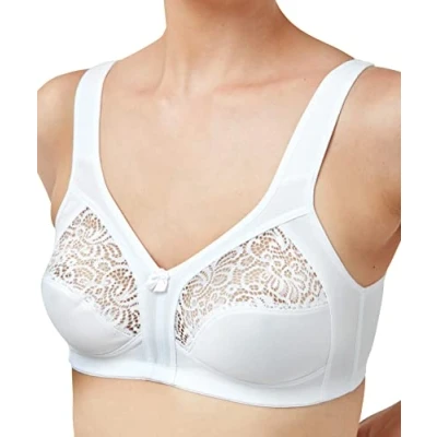 Our Courtney pretty lace detail non-wired bra provides great support , comfort & shaping without wires . You'll find the clever design encircles the bust for firm control and the lovely lace cup detail & satin bow add a touch of feminine charm. With fine plastic boning at the sides, our Courtney ladies wire free bra has support & shape without underwiring .We've added wider adjustable straps to perfect the fit for you and the double hook & eye closure helps keep everything in place.