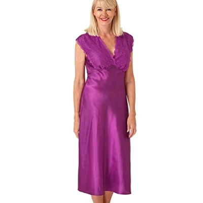 Perfect For A Special Occasion Or Treating Yourself To A Touch Of Glamour Everyday. Our Julia Ladies Satin Nightgown Has A Full Back & Provides More Coverage Than Our Other Styles. You'll Find Deeper Shoulders With A Capped Sleeve Effect & We've Lined Our All-Lace Cups With Satin Too. We've Kept The Styling Simple With Self-Binding Trim Around The Armholes & Back Neckline, & Added Side Ties For Flattering Feminine Shaping . You'll Find Our Julia Long Satin Nightie Is Bias-Cut So Flows Over Your Curves. And We've A Choice Of 3 Flattering Colourways Too, Designed To Match Up Perfectly With Plain & Print Robes In Our Lovely Satin Range. Perfect For A Special Occasion Or Treating Yourself To A Touch Of Glamour Everyday.
