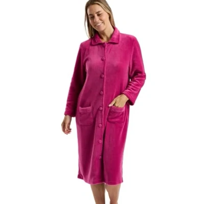 Marlon Womens Ramona Cosy Coral Fleece Housecoat Soft & Warm Robe With Button or Zip Closure, Peter Pan Collar Pockets, Raspberry, 8 10
