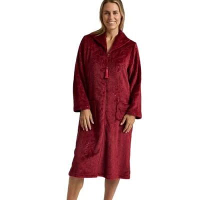 Marlon Womens Serena Zip Front Embossed Fleece Housecoat Up Bath Robe, Claret Swirl, S