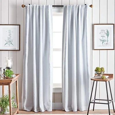 BLACKOUT CURTAINS Solid color window curtain panel pair from Martha Stewart's Bedford Country Farmhouse Window Collection VERSATILE Enjoy the comfort of your home with Martha Stewart blackout curtains; Refresh your room in an instant with timeless long window curtains; Hang curtains in family room, living room, dining room, home office or bedroom STYLING OPTIONS Easily hang curtain panel pair using the rod pocket or back tabs; For proper fullness, fabric should measure 2 to 3 times the width of window frame (not width of window) TRIPLE PASS FOAM LINING Set of two panels will block light from entering room; Lined window curtains keep out unwanted sources of sunlight, noise and drafts; Lined curtain panels help prevent floors, rugs and furniture from fading EASY CARE Machine washable curtains; Includes 2 curtain panels; Available in 50 x 84 and 50 x 95 inch lengths; Curtain is 50% cotton, 50% linen