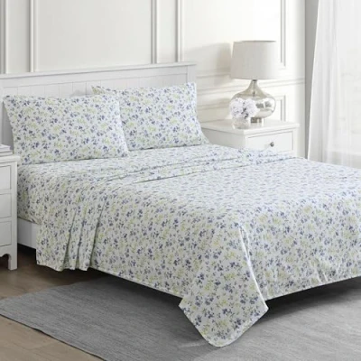 Martha Stewart Ruth Ditsy Floral 300TC 100% Cotton Percale Sheet Set, Blue/White, 4 Piece 1 Flat Sheet, Fitted 2 Std Pillowcases, Breathable Printed Bed Sheets, Queen Size