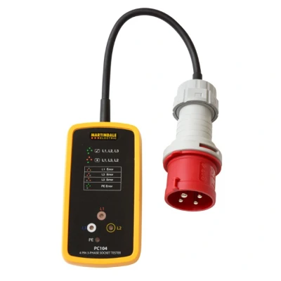 Martindale PC104 3-phase socket tester for 415V 16A outlets. Checks phase sequence, presence, and PE in 4-pin sockets. Green/red LED indicators for quick socket condition analysis.