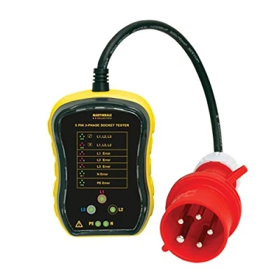Martindale PC105. 3-phase socket tester for 16A 5-pin outlets. Quick phase, sequence, PE and neutral verification. Automatic LED indicator for correct/faulty socket connections.